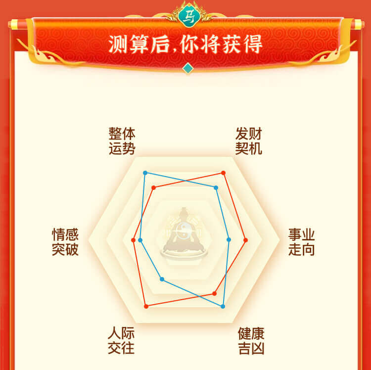 测算结果仅供娱乐,请勿盲目迷信。我平台产品拒绝向未成年提供服务,如未成年人使用且造成不利影响,一切后果由其监护人自动承担!测试结果不得作为生活,工作之指导。